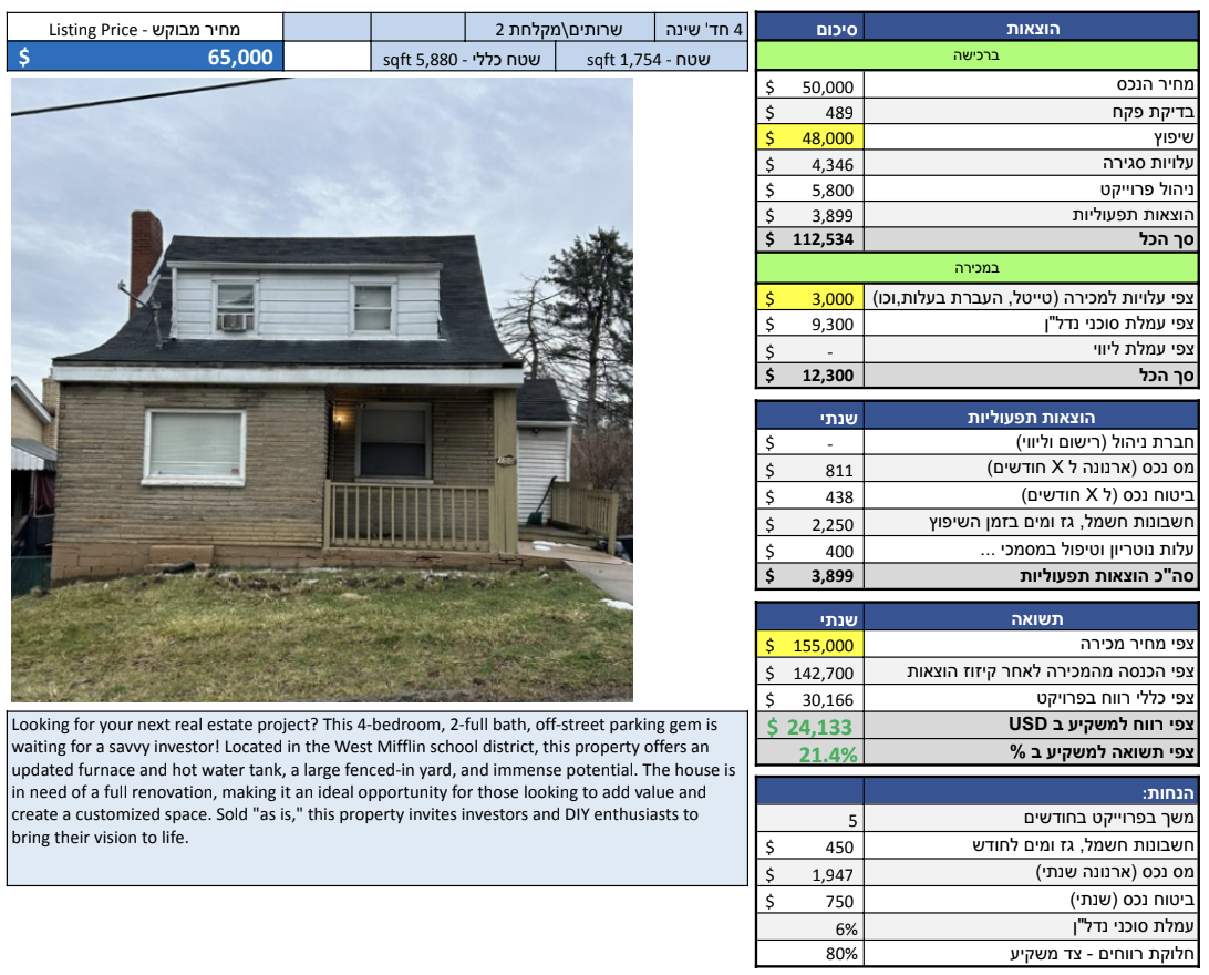 שכונת Homestead היא שכונה מתפתחת בפיטסבורג. זאת שכונה יחסית קטנה שבה גרים בעיקר בעלי בתים, משפחות וכו’. כלומר זה אזור מעולה לעשות בו פליפ כי סביר להניח שהקונה שלנו תהיה משפחה, שתהיה מוכנה לקנות את הנכס במחיר גבוהה.
