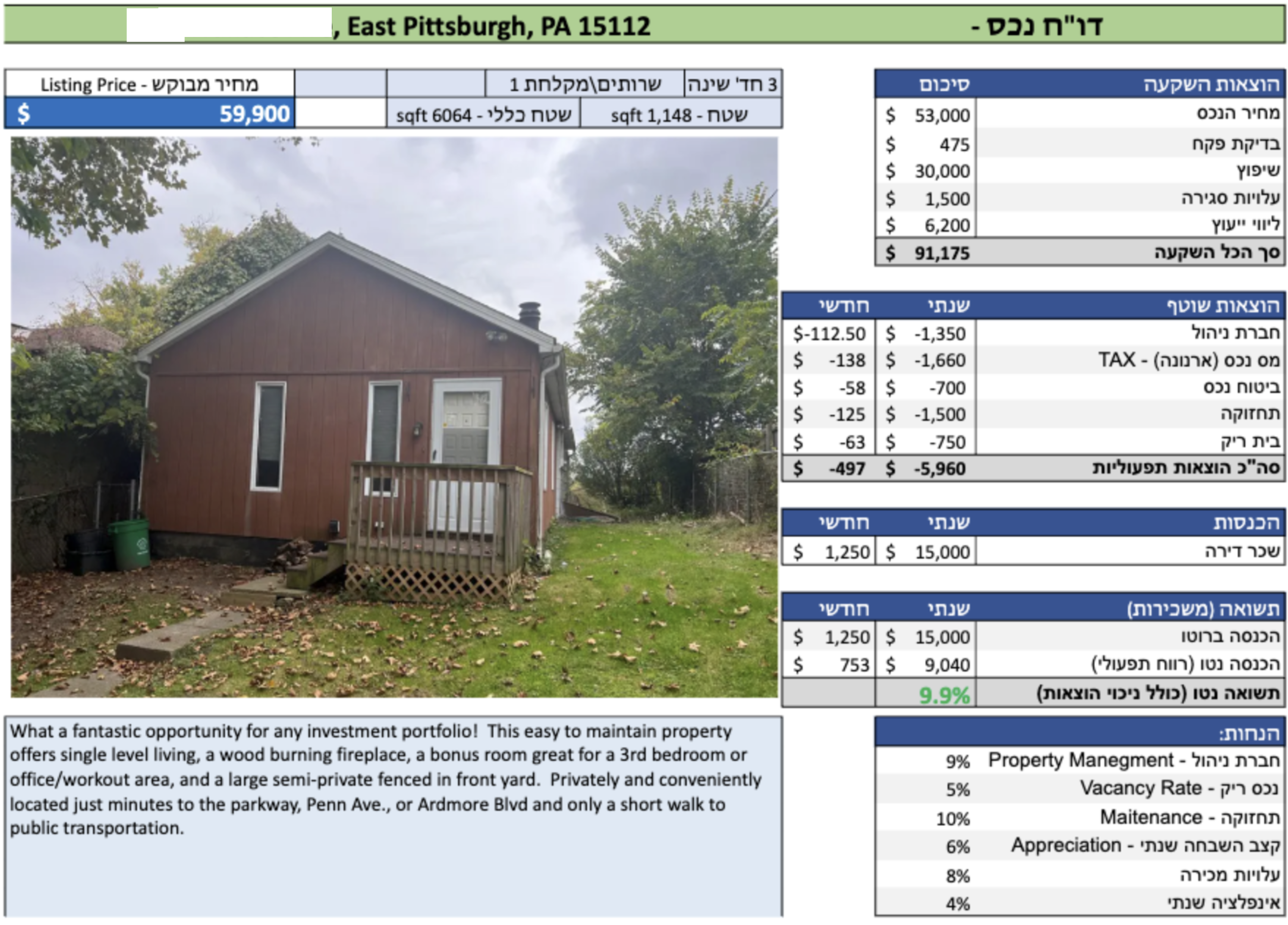 • הנכס יצא למכירה ב69,900$ ירד פעם נוספת ולבסוף קנינו ב53,000$.